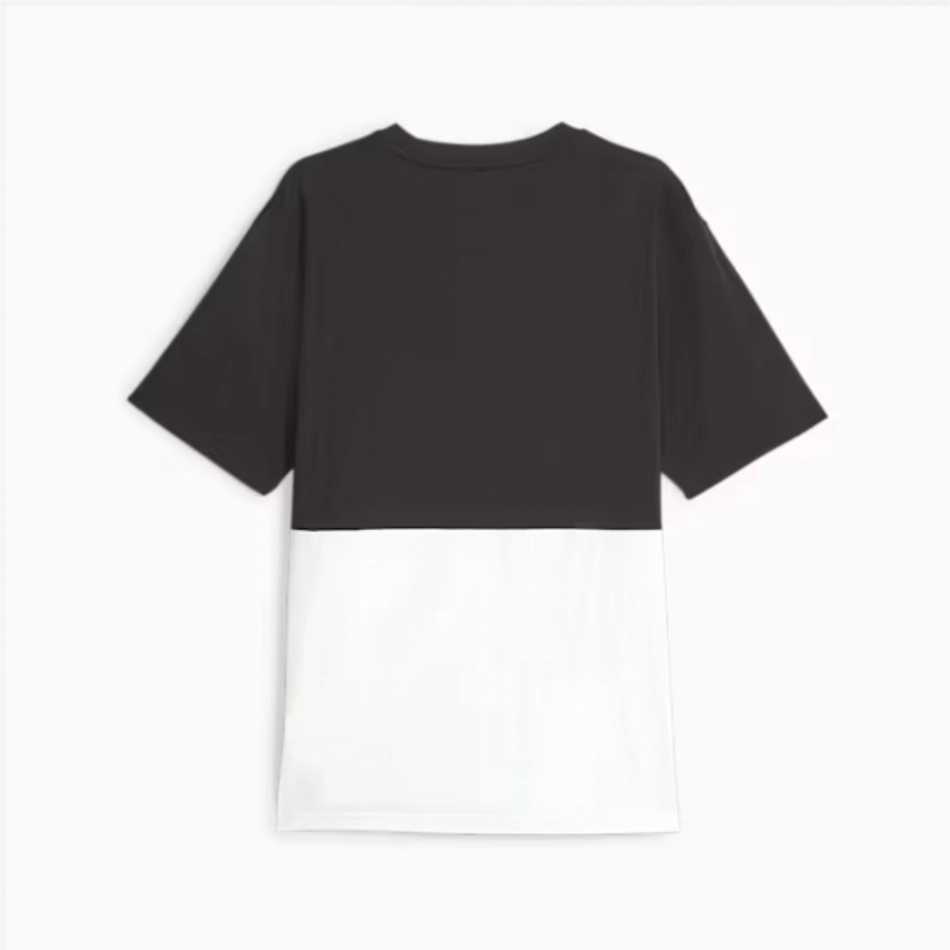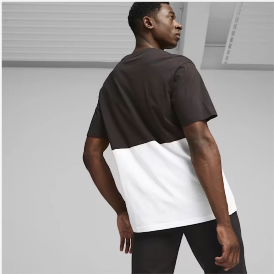 Confecționat din 100% bumbac, acest tricou are un grafic PUMA Wordmark de dimensiuni mari și un design colorblock pe partea dreaptă.